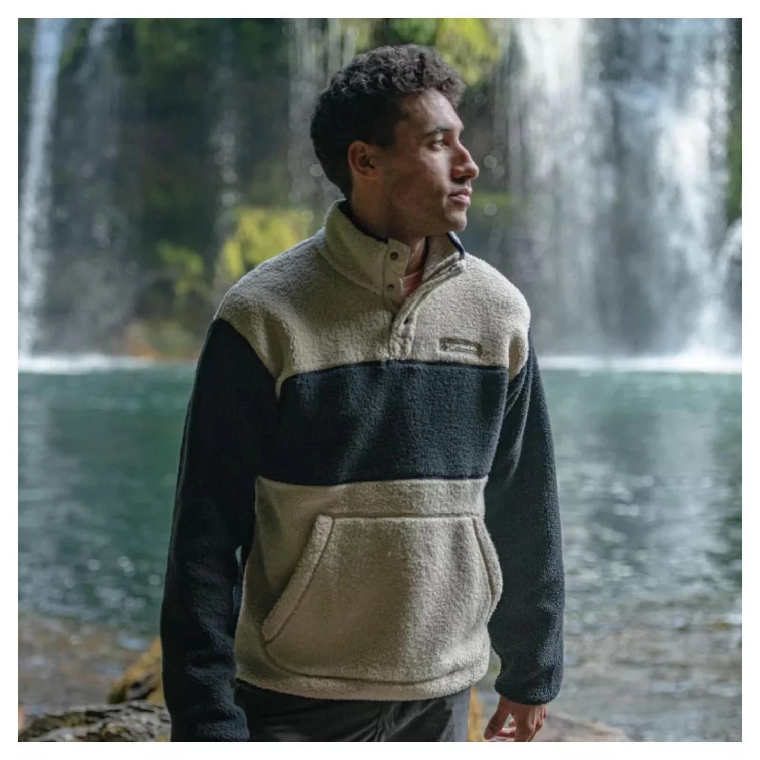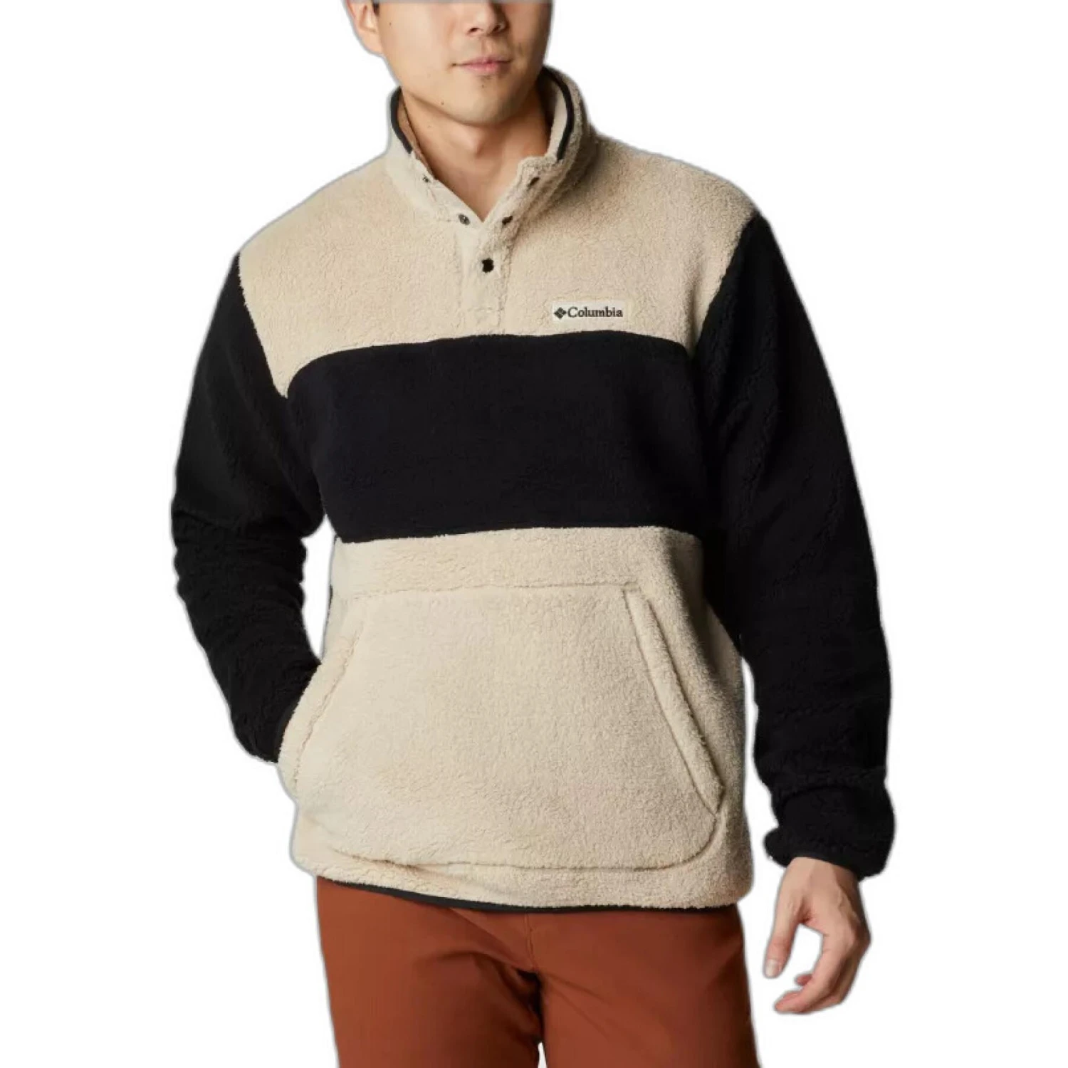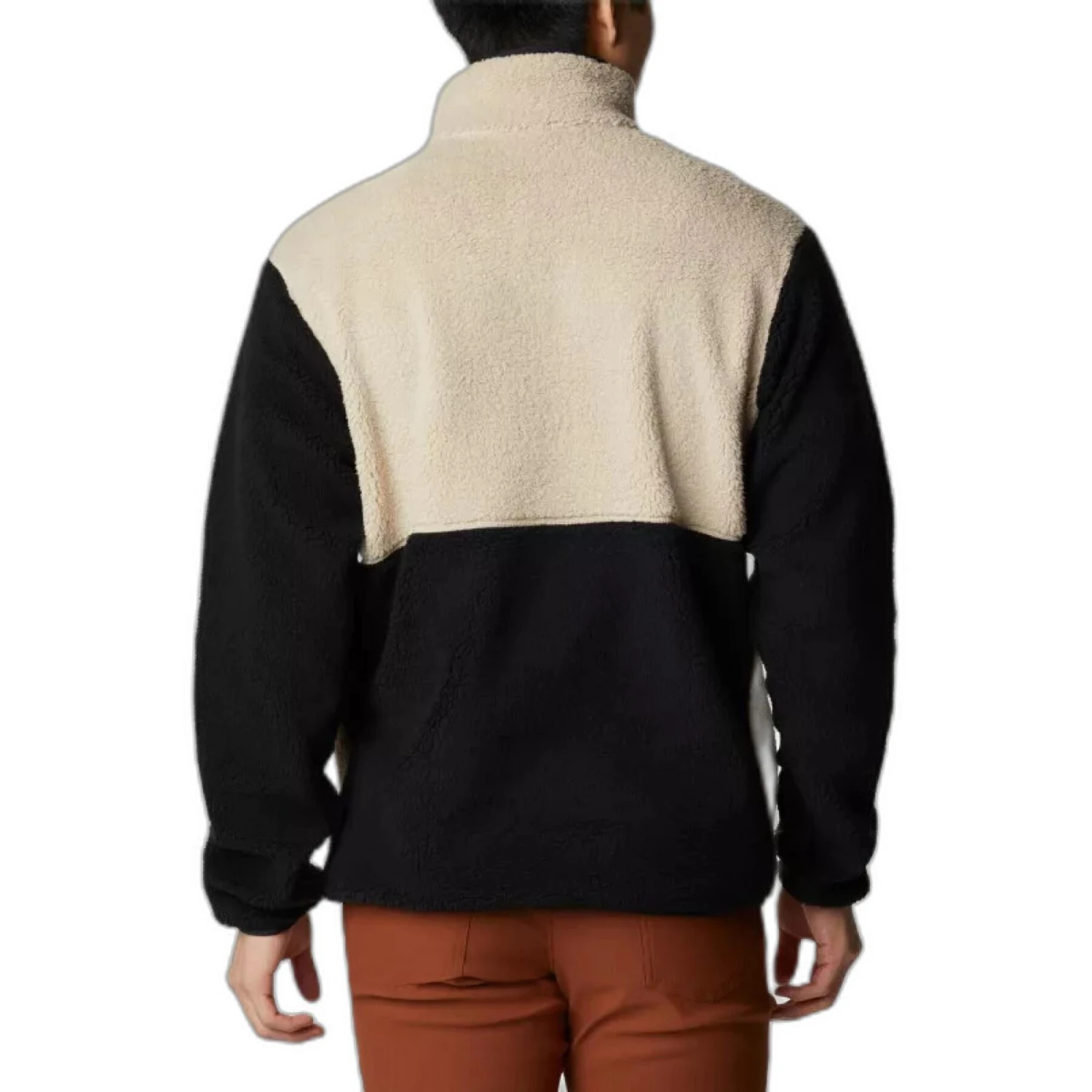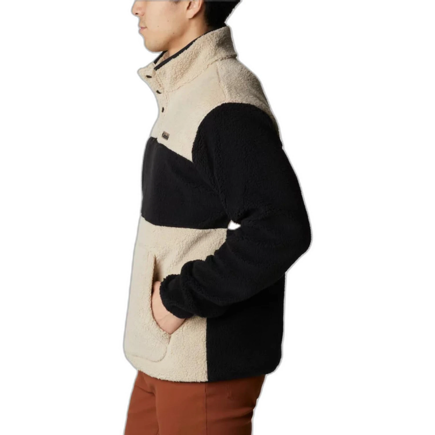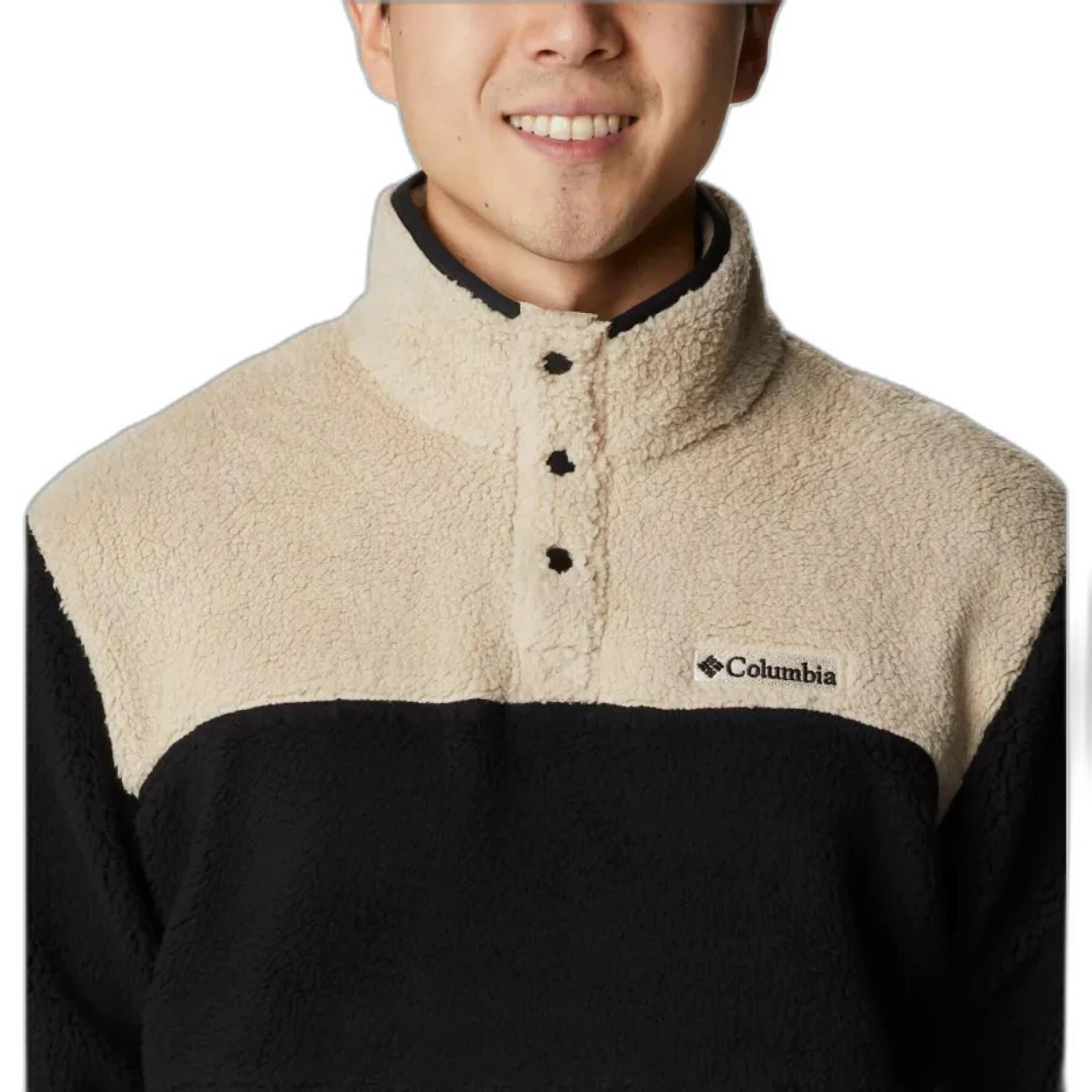 Ce haut à empiècements présente une construction en sherpa doux et chaud, tandis que la fermeture semi-boutonnée offre un look contemporain.